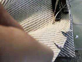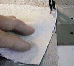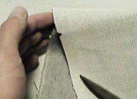 In this view we have turned the new cover over and are sewing the main fabric piece to the front of the boxing. Lap over the previous stitching a half inch or so. Make a couple of cuts near the corner to relax the material as you round the corner. Sew to about 1/2" of the corner, leave the needle in and turn.